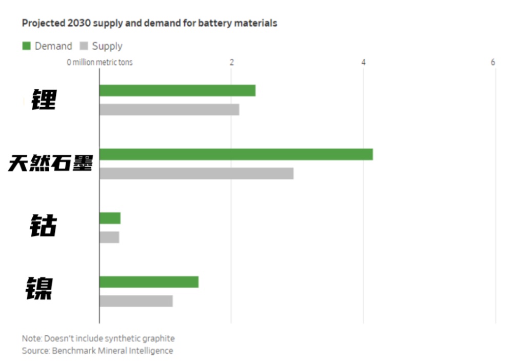 Benchmark預計2030年各電池原材料的供需情況(來源:華爾街日報)
