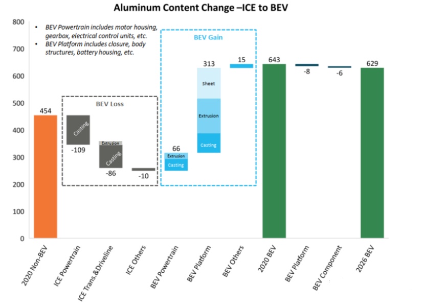 鋁是電動汽車制造必需的材料之一,鋁在電動汽車系統中的應用包括各種覆蓋件、車身框架、底盤、電池箱(托盤)、防撞梁,以及電機與傳動系統、電池系統等。