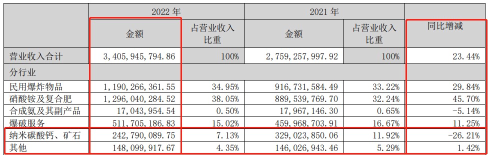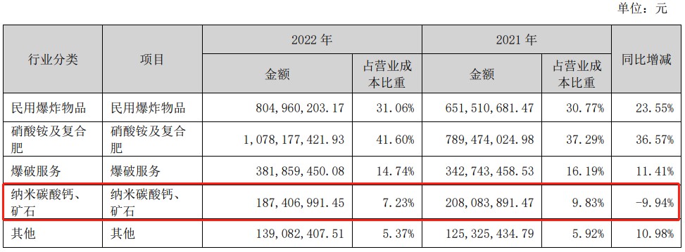 2022年礦業(yè)板塊營收242,790,089.75元,占營業(yè)成本比重7.23%,同比減少26.21%。其中,納米碳酸鈣營收35,656,340.29元,同比減少22.86%。