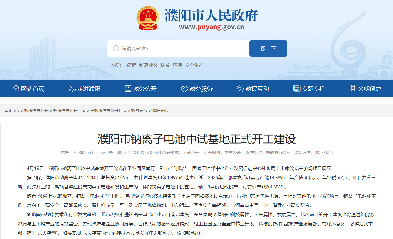 據了解,濮陽市鈉離子電池產業項目總投資51億元,共計劃建設14條1GWh產能生產線,2025年全部建成后可實現產能14GWh,年產值50億元,年納稅5億元。項目共分三期,此次開工的一期項目將建設集鈉離子電池研發和生產為一體的鈉離子電池中試基地,預計9月份建成投產,可實現產能200MWh。