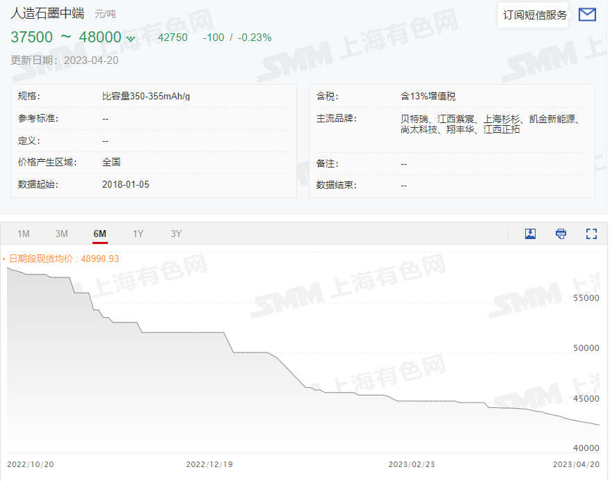 伴隨負(fù)極產(chǎn)能的釋放,2022年下半年以來,負(fù)極材料的價格也按下了“加速下滑鍵”,據(jù)SMM數(shù)據(jù)顯示,目前主流的中端人造石墨均價已跌至4.3萬元/噸。
