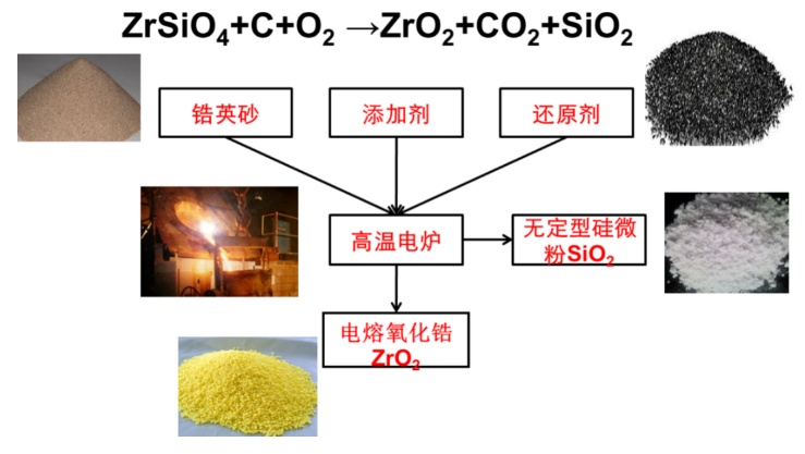電熔氧化鋯的生產過程是脫硅過程和穩定化過程的集合,以鋯英石為原料,以石墨為還原劑,加入少量的催化劑或者穩定劑,在電弧爐的高溫作用下根據ZrO2、SiO2的熔點差異,使鋯英砂分解還原并除去硅、鈦、鐵、鋁等雜質元素,最后生成氧化鋯和硅微粉,氧化鋯經壓縮空氣噴吹成球狀,再經過后期粉碎工藝加工處理,分級包裝后入庫。
