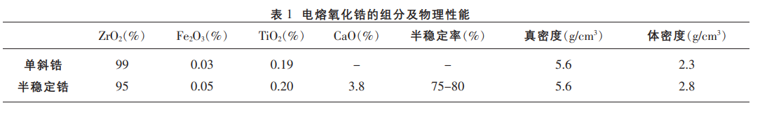單斜電熔氧化鋯的晶型為單斜型,半穩定型氧化鋯晶型為單斜、四方和立方3種晶型混合存在。