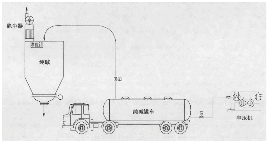 目前國內大型浮法玻璃廠采用氣力輸送純堿的較多,純堿以罐車運輸的形式進廠,原料車間設計有空氣壓縮機,原料車間純堿料倉安裝有氣力輸送管道,管道入料口與罐車上的料罐連接,罐車上的料罐與原料車間設計的空氣壓縮機連接,啟動空氣壓縮機,純堿粉料將通過氣力輸送管道進入原料車間純堿配料倉,倉頂設置有除塵器,吸收輸送過程中產生的粉塵,整個輸送過程都在相對密閉的環境中進行,生產時粉塵較少。