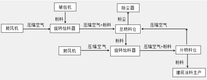 涂料廠粉料主要有鈦白粉、硅酸鋁、滑石粉、碳酸鈣,粉料易揮發,從而形成粉塵,隨空氣的流動而擴散于大氣中,對人體的呼吸系統造成傷害。涂料廠采用氣力輸送工藝技術輸送粉料,可實現自動控制,減少人力成本,避免粉塵帶來的職業病健康風險,實現了清潔生產。