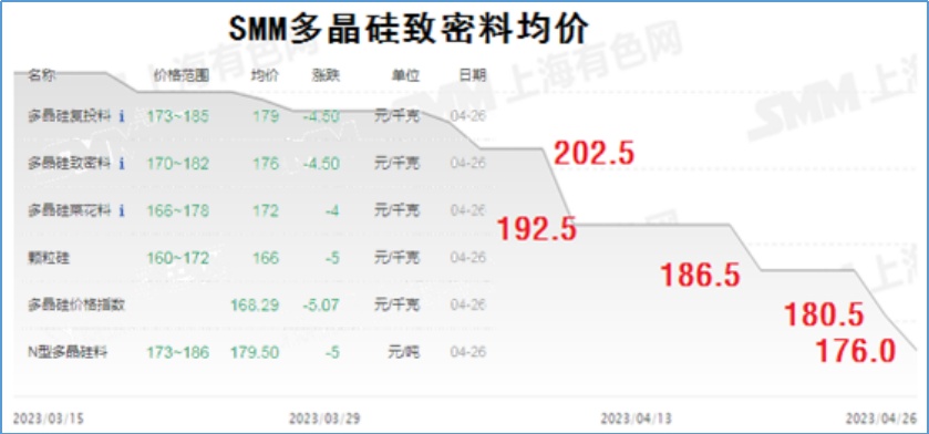 另外,SMM上海有色金屬網硅料價格4月26日日報顯示:繼昨日(4/25)硅料價格指數逼近170后,今日再跌破170大關至168.29元/kg。而多晶硅復投料、致密料、n型硅料也從180時代全面進入170時代,顆粒硅僅166元/kg。