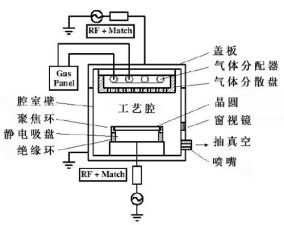 干法刻蝕也被稱為等離子刻蝕,在半導體刻蝕中占主流地位。等離子體刻蝕機根據等離子體產生和控制技術的不同而大致分為兩大類,即電容耦合等離子體刻蝕(CCP)刻蝕機和電感耦合等離子體(ICP)刻蝕機。CCP刻蝕機主要用于電介質材料的刻蝕工藝,ICP刻蝕機主要用于硅刻蝕和金屬刻蝕,亦稱為導體刻蝕機。介質刻蝕的對象是氧化硅、氮化硅、二氧化鉿等介質材料,而導體刻蝕的對象包括硅材料(單晶硅、多晶硅和硅化物等)和金屬材料(鋁、鎢等)。