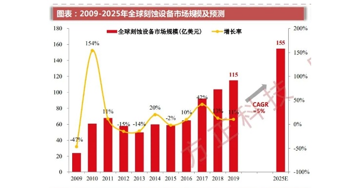 近年來,5G、AIoT等新興技術合力推動下,產業智能化進程加速,下游應用市場需求迸發,拉動著全球半導體需求放量上漲,反向驅動上游半導體制造設備需求和技術更迭。據方正證券報告預計,全球晶圓制造設備(WFE)市場規模將達到850億美元量級。SEMI預測2025年全球刻蝕設備市場規模將增長至155億美元(約合超1000億元),CAGR約為5%。