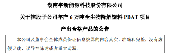5月5日,宇新股份(002986)發布關于控股子公司年產6萬噸全生物降解塑料PBAT項目產出合格產品的公告。據悉,該項目已于2023年3月13日取得《危險化學品建設項目試生產(使用)方案備案回執》,進入試生產階段后,經過對裝置相關設備的安裝和調試、技術工藝參數的優化和調整,現已產出各項指標均達到優等品標準的產品。
