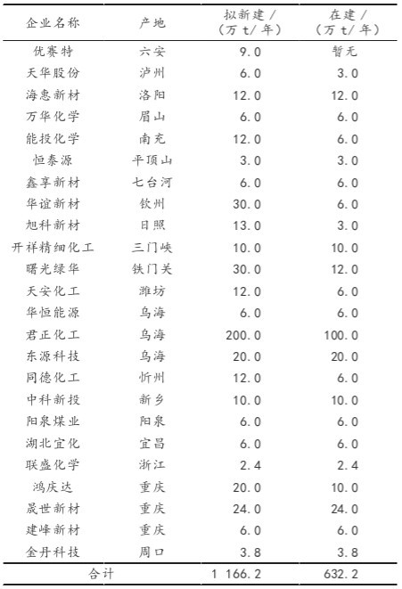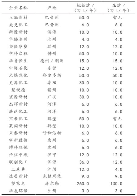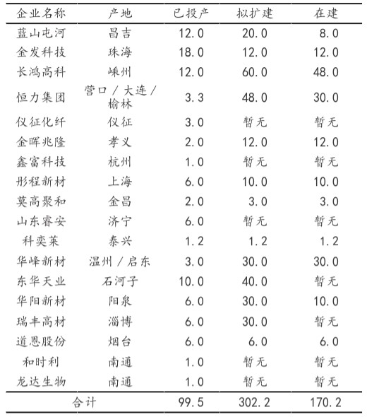 國內PBAT新建企業產能一覽表 單位:萬t/年
