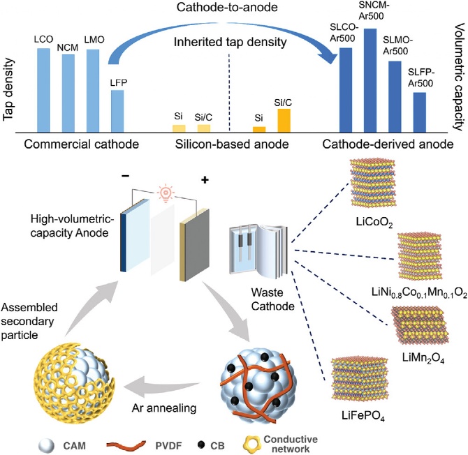圖1.退役正極轉(zhuǎn)化為高體積比容量負(fù)極的設(shè)計(jì)示意圖。