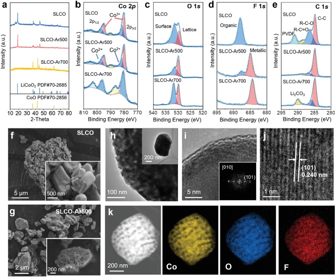 不同回收條件所得鈷酸鋰的XRD及XPS譜圖顯示,在合適退火條件下回收的鈷酸鋰的物相將得到保持,并引入鋰離子導(dǎo)體LiF(如圖2a-e所示)。回收前的退役鈷酸鋰呈現(xiàn)具有裂紋的單晶顆粒形貌(如圖2f所示),經(jīng)過退火回收工藝可演化形成二次納米顆粒組裝的形貌(如圖2g所示)。EDX映射證明LiF在回收材料中的均勻分布。