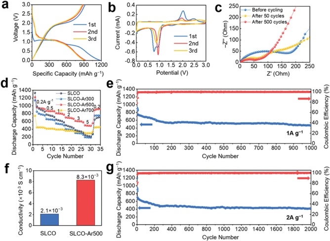 圖3.回收的鈷酸鋰派生物的電化學(xué)性能。(a)前三圈GCD曲線,(b)前三圈CV曲線,(c)循環(huán)前后不同圈數(shù)的EIS曲線,(d)不同回收條件的鈷酸鋰派生物的倍率性能,(e,g)不同電流下的循環(huán)性能,(f)回收前后的電導(dǎo)率對(duì)比。