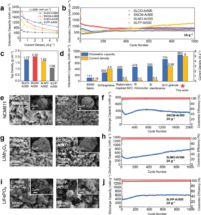 圖4.將回收策略推廣至其他退役正極。(a)不同倍率的體積比容量,(b)體積比容量的循環(huán)穩(wěn)定性,(c)振實(shí)密度,(d)與文獻(xiàn)硅基負(fù)極性能對(duì)比,(e,g,i)回收前后的SEM,(f,h,j)推廣的其他退役正極回收后的循環(huán)性能。