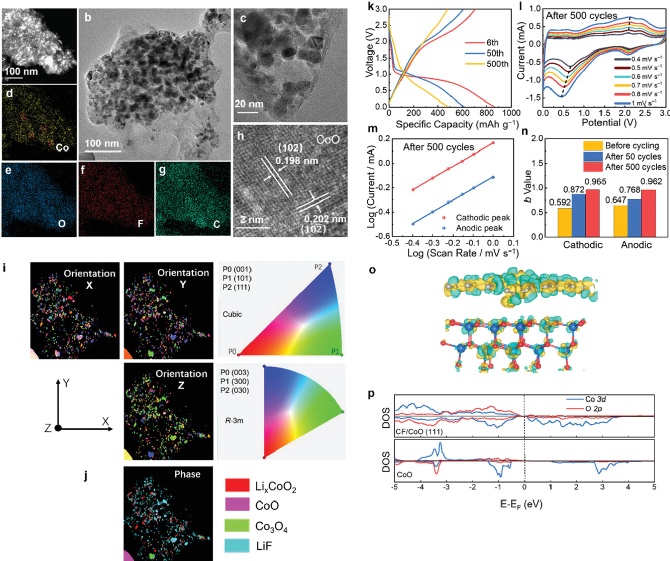 圖5.回收鈷酸鋰的機(jī)理分析。(a,d-g)循環(huán)后鈷酸鋰的STEM-EDX映射,(b-c,h)循環(huán)后鈷酸鋰的TEM圖像,(i)循環(huán)后鈷酸鋰的晶體取向分布和(j)物相分布,(k-n)循環(huán)后鈷酸鋰的電化學(xué)表征,(o)CF/CoO的CDD概況(111),黃色和青色區(qū)域分別代表電荷積累和消耗,(p)CoO和CF/CoO的PDOS(111)。