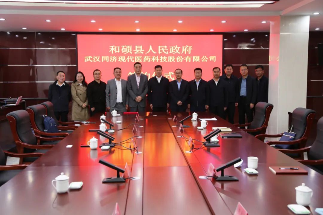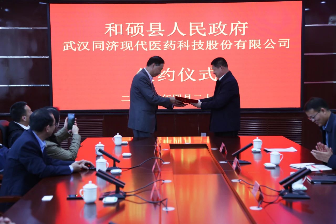 和碩縣委書記朱軍,原中國無機鹽工業協會碳酸鈣行業分會會長、專家組組長劉樹文,武漢同濟現代醫藥有限公司董事長李亦武見證簽約并講話。和碩縣委副書記、常務副縣長朱宏偉與武漢同濟現代醫藥有限公司董事長李亦武簽訂戰略合作意向書。