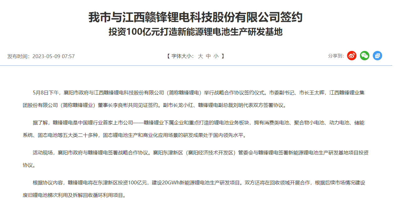 根據(jù)協(xié)議內(nèi)容,贛鋒鋰電將在東津新區(qū)投資100億元,建設20GWh新能源鋰電池生產(chǎn)研發(fā)項目。雙方還將在回收領(lǐng)域開展合作,根據(jù)后續(xù)市場情況建設廢舊鋰電池梯次利用及拆解回收循環(huán)利用項目。