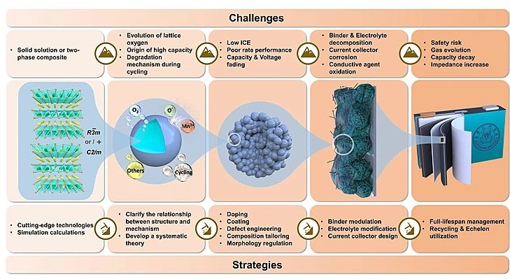 圖1. 富鋰正極材料從晶體結構到實際應用各個階段面臨的挑戰和策略概述