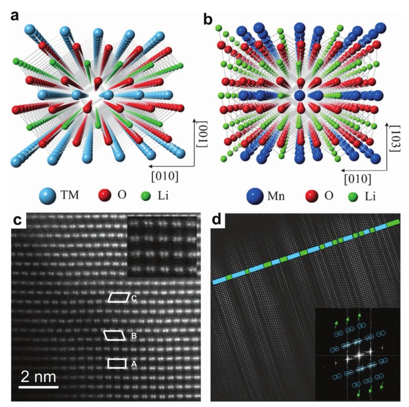 圖2.a) R-3m空間群LiTMO2的晶體結構圖;b)C2/m空間群Li2MnO3的晶體結構圖;c)富鋰正極材料的STEM圖像;d)LiTMO2部分(綠色)和Li2MnO3部分(藍色)的濾波圖像。