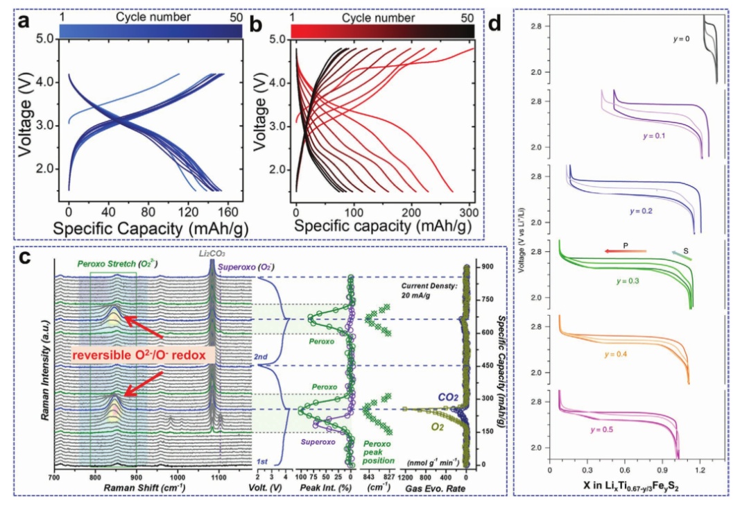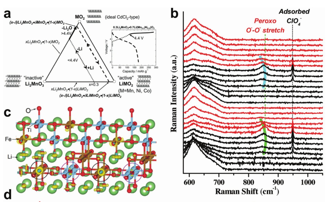 圖3. a)富鋰正極材料的電化學反應途徑;b)富鋰正極材料的原位拉曼光譜;c)Li1.2Ti0.4Fe0.4O2的電荷密度差圖;d)STEM圖像和EDS元素映射說明了富鋰正極材料中裂紋的形成。