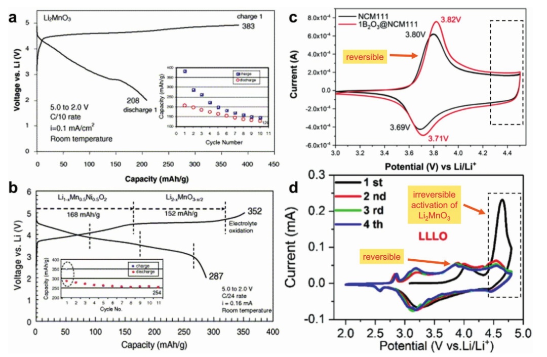 圖5.a)Li/Li2MnO3電池的電化學充放電曲線;b) Li/0.3Li2MnO3∙0.7LiMn0.5Ni0.5O2電池的初始充放電特性;c)三元NCM111和1B2O3@ NCM111陰極的初始循環伏安曲線;d) 富鋰正極材料的CV圖。