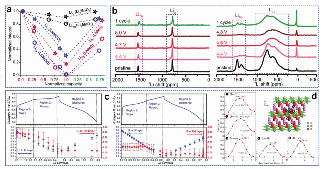 圖6. a)循環電極的7Li核磁共振信號積分比較;b) Li2MnO3(左)和LNMCO(右)電極的7Li各向同性NMR譜;c)Li(Lix/3Ni(3/8−3x/8)Co(1/4−x/4)Mn(3/8+7x/24)O2(HLR,左)和Li(Lix/3Ni(1/3−x/3)Co(1/3−x/3)Mn(1/3+x/3)O2 (LLR,右)在不同的鋰離子溶出/鋰化狀態下的電化學充放電曲線;d)利用FPMD模擬,用輕推彈性帶(NEB)方法計算從Li原子軌跡中檢測到的5個典型的鋰位點之間的移動能壘。