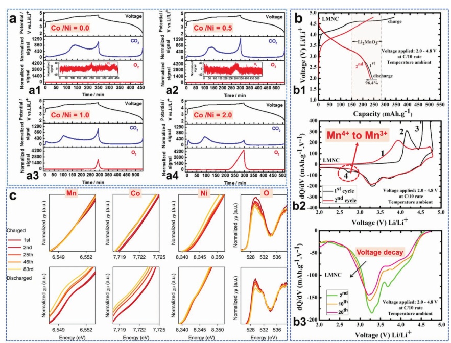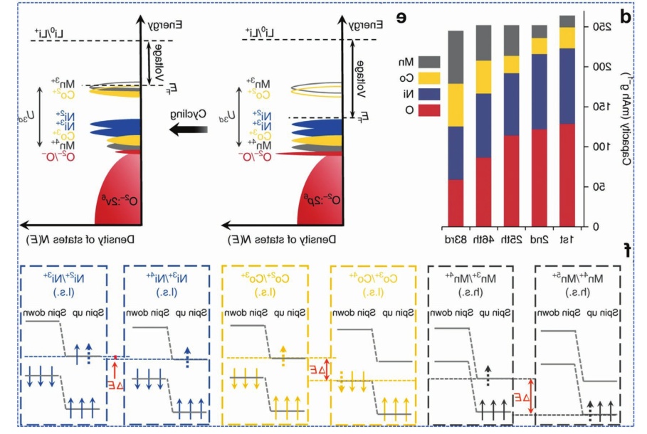 圖7.a)富鋰正極的CO2(m/z= 44)和O2(m/z=32)演變圖;b)制備的原始LRM的前兩條充放電曲線和相應的dQ/dV曲線;c)Li1.2Ni0.15Co0.1Mn0.55O2中不同元素在不同循環下的XAS結果;d)在不同循環中,每個元素對放電容量的貢獻;e)費米能級的圖解;f)不同氧化還原偶的圖表。