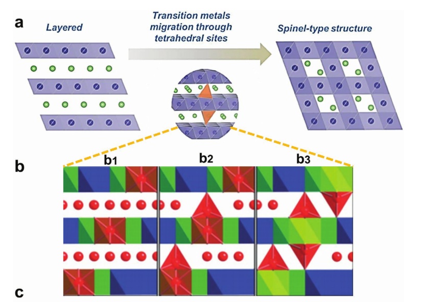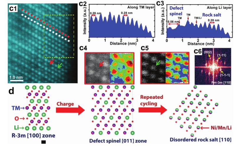 圖8.a)層狀向尖晶石型相變示意圖;b)Li-Li對稱示意圖;c)富鋰材料經過十次循環后的晶體結構;c1)高分辨率STEM圖像;c2)峰強圖;c3)沿著白色虛線(Li層)繪制強度圖,如(c1)所示;c4)放大的STEM圖像顯示了缺陷尖晶石結構(LT-LiCoO2型結構),空洞的16c八面體位置;c5)放大的STEM圖像顯示了結構的八面體位置(無序的巖鹽結構);c6)從(c1)中黃色虛線矩形表示的區域進行快速傅里葉變換(FFT);d)解釋結構演化路徑的原子模型。