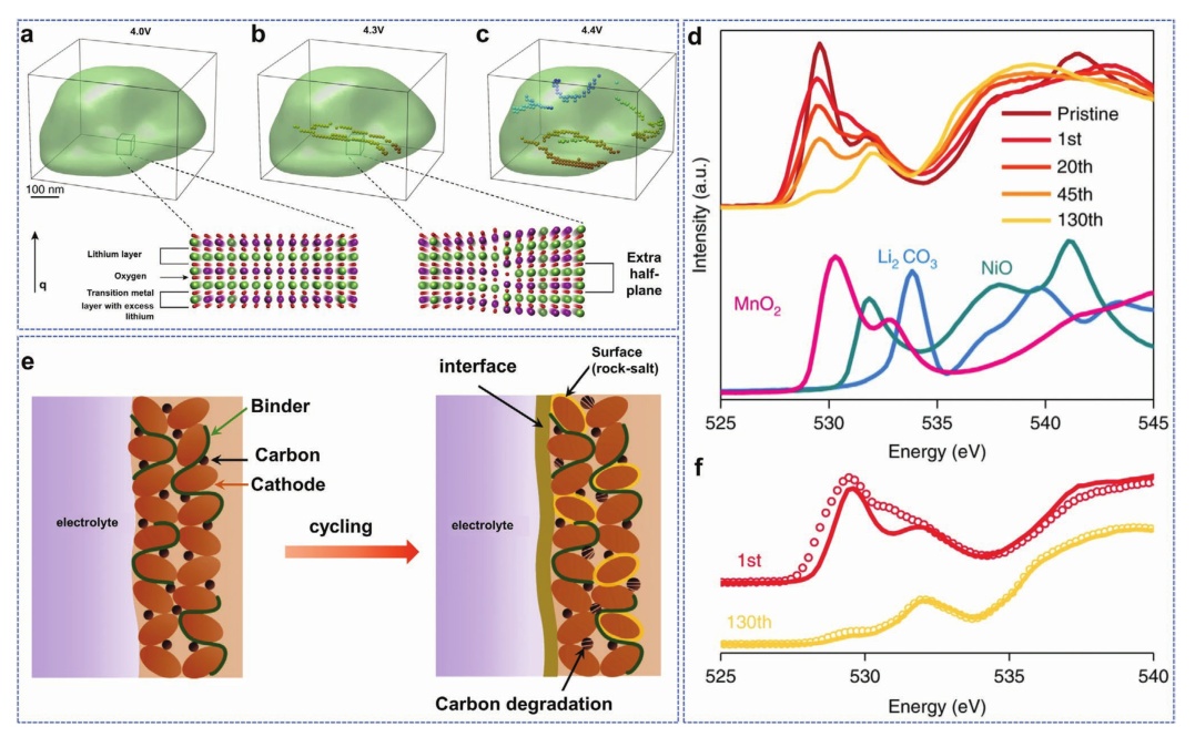 圖9.a - c)充電過程中位錯網絡的形成;d)不同周期樣品的PEY O K-edge的XAS;e)帶電(圓符號)和放電(線)樣品PEY中的O k-edge的XAS;f) Li1.2Ni0.15Co0.1Mn0.55O2活性材料的界面形成和表面重建。