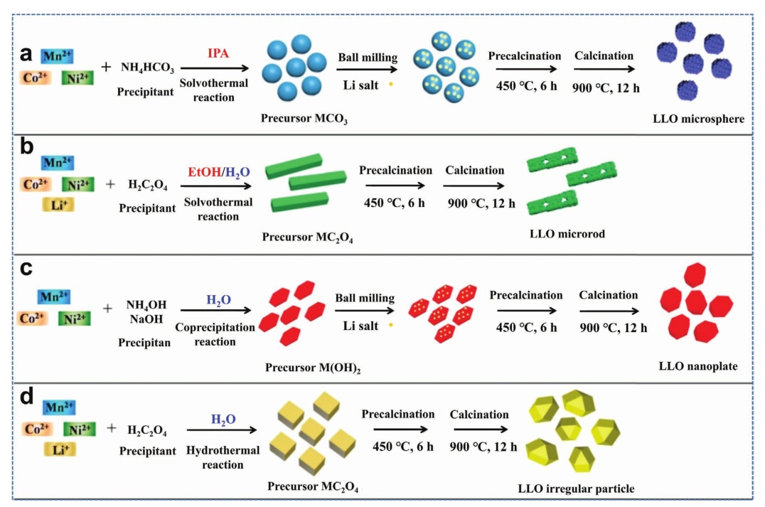 圖10.富鋰正極材料的微球a)、微棒b)、納米板c)和不規則粒子d)的形成過程示意圖。