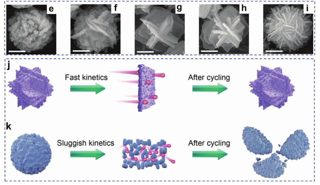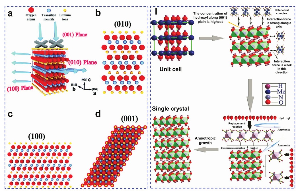圖11. a)層狀鋰金屬氧化物正極的晶體結構,b)(010)平面,c)(100)平面,d)(001)平面;e-i) 富鋰基碳酸鹽前驅體的SEM圖像;j)不同的鋰在三維立方體正極和k)常見的0D類微球正極中的擴散動力學;l) Ni1/3Co1/3Mn1/3(OH)2晶體的各向異性生長過程。