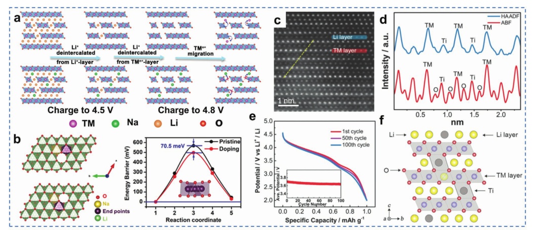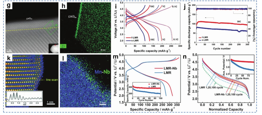 圖12.a) 富鋰正極材料的結構演化示意圖;b) Na+摻雜富鋰錳基正極材料的計算模型和結果;制備的LT-LRM的結構:c) HAADF圖像和d)沿(c)中標記的虛線的Ti、TM和O的相應線掃描剖面;e)一些選定的LT-LRM的標準化放電電位剖面;f) Li-Ti混合結構示意圖;g)沿[010]區軸投影的f-LRM(202)面附近的體到表面區域的原子尺度z對比度圖像;h)電化學循環下f-LRM粒子中Zr4+的STEM-EDS映射;i) f-和s-LRM的充放電電壓分布;j) f-和s-LRM的循環穩定性;k) LRM-Nb樣品近表面的HAADF圖像;l) Mn和Nb對應的EDS映射;m)初始周期剖面;n)一些選定的標準化放電剖面。