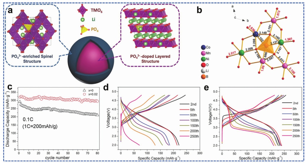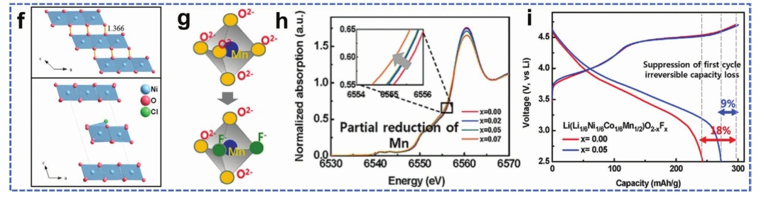 圖13.a)表層結構誘導過渡示意圖;b) BO4優化后的Bx-LRM晶體結構示意圖;c)當x=0和0.02時,Bx-LRM的循環性能;d-e)當d)x=0和e)x=0.02時Bx-LRM的電壓變化;f) NiO3(上)和NiO2.875Cl0.125(下)溶解態的結構響應;g) F摻雜LRM的優化晶體結構示意圖;h)XANES光譜;i) Li[Li1/6Ni1/6Co1/6Mn1/2]O2−xFx的初始充放電曲線(x=0.00,0.05)。