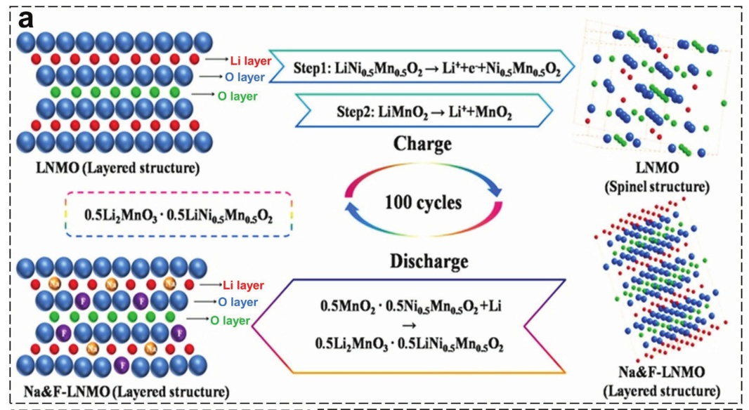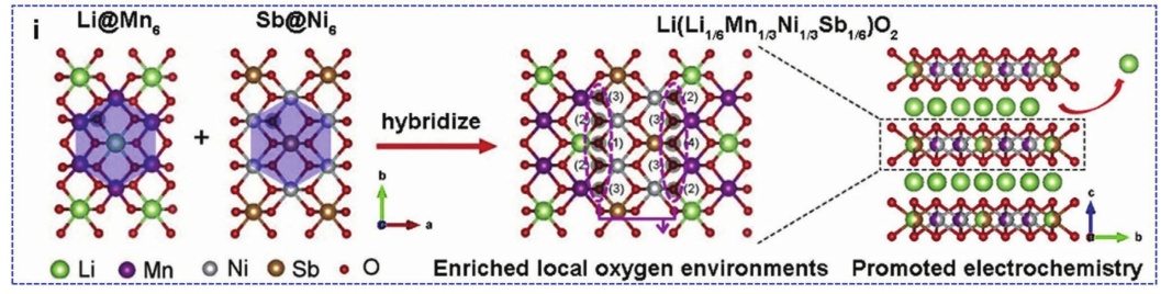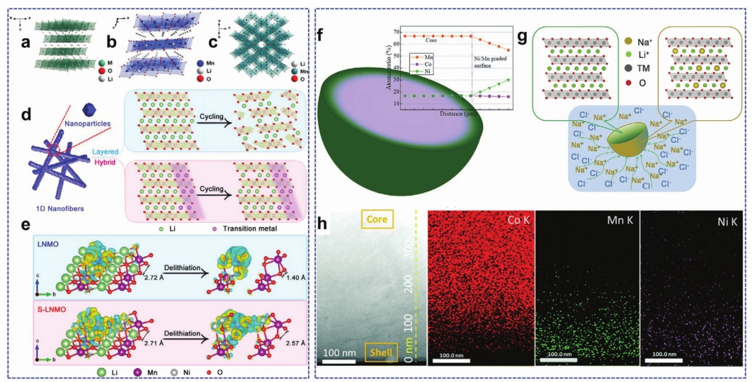 圖17.a)層狀LiTMO2晶體結構示意圖;b)單斜Li2MnO3、c) Li4Mn5O12尖晶石相;d)一維異質尖晶石/層狀富鋰正極的結構優點示意圖;e) DFT計算Li2MnO3與尖晶石包覆Li2MnO3脫色前后的電荷密度差;f) Ni/Mn梯度的富鋰材料示意圖;g)表面梯度Na+摻雜富鋰正極材料示意圖;h)制備FIB后G-LCO粒子的STEM圖像和Co、Mn、Ni元素的EDS映射;i) 富鋰正極合成示意圖。