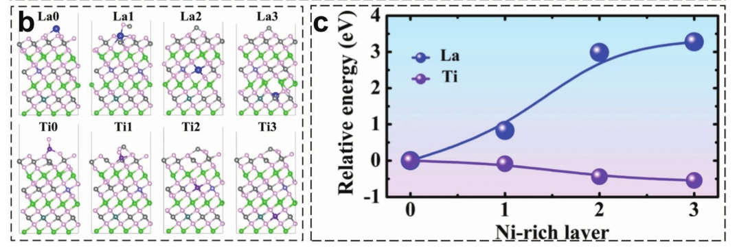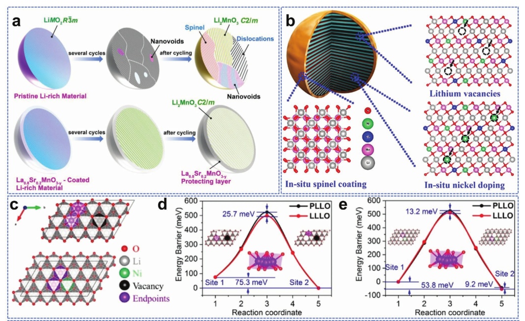 圖14.a) Na和F共摻雜富鋰正極材料在去除鋰離子過程中的結構示意圖;b) La和Ti分別摻雜到表面、富鎳第一層、富鎳第二層和富鎳第三層,其遷移能差如(c)所示。