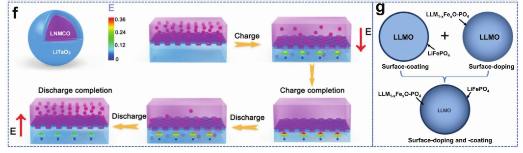 圖15.a)原始LRM(上)和LSM涂層(下)的結構演化示意圖;b-e) LLLO的設計;f) LiTaO3-LRM材料的LiTaO3改性層的動態和壓電方案;g) LiFePO4表面涂層和表面摻雜層狀富鋰氧化物示意圖。