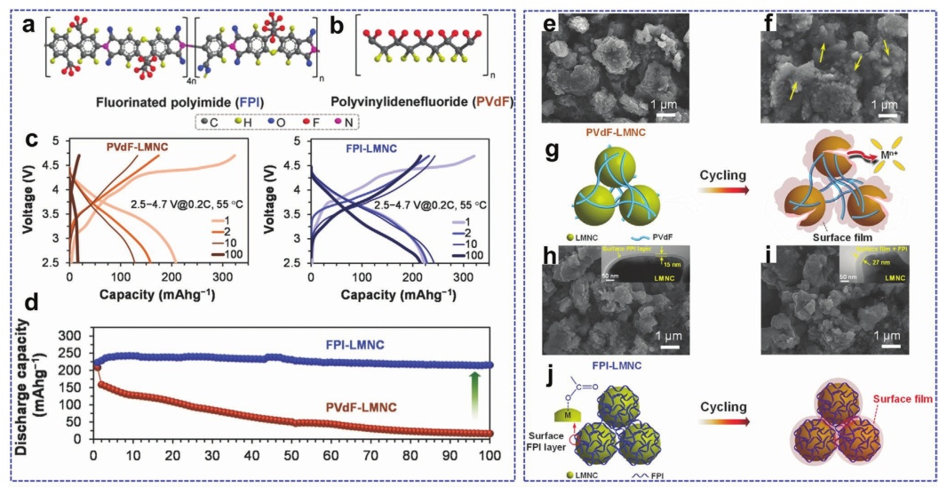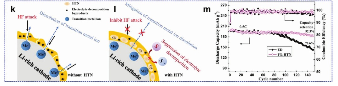 圖18.a)氟化聚酰亞胺(FPI)球棍型和b)聚偏氟乙烯(PVDF)粘合劑;c) PVDF-LRM//石墨(左)和FPI-LRM//石墨全電池(右)的充放電電壓分布,以及它們的d)循環性能;PVDF-LRM正極e)和f)100次循環前后的粒子形態,FPI-LRM正極;h)和i)100次循環前后的粒子形態,g, j)分別為其粒子形態和表面狀態變化示意圖;k)原始富鋰正極和l)1,3,6-己二腈(HTN)添加劑在正極電解質上的表面改性機理的示意圖;m)在ED和含HTN的電解液中循環LRM/Li細胞的循環性能。