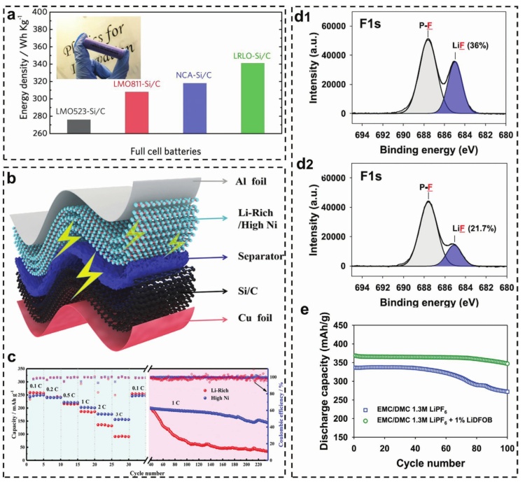 圖20.a)18650正極材料電池的能量密度;b,c)富鋰LRM/Si/C全電池制造示意圖及其速率容量。d1)不添加LiDFOB預循環后富鋰正極的F 1s XPS譜;d2)添加LiDFOB后富鋰正極的F 1s XPS譜;e)無電解液,含/不含1%的LiDFOB放電容量保持在C/2超過100次的循環曲線。