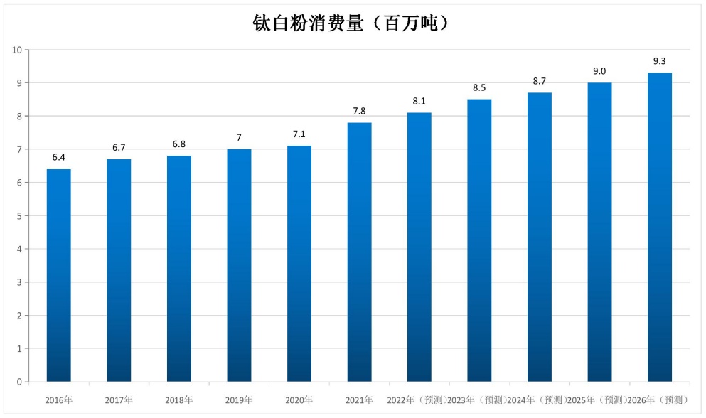 由于涂料行業、塑料行業和造紙行業等下游行業的需求日益增加,全球鈦白粉消費量出現穩定增長,2016年至2021年的復合年增長率為3.9%。展望未來,隨著全球宏觀經濟的穩定發展和新興經濟體需求的增加,預計全球鈦白粉消費量將保持穩定增長,2026年將達到930萬噸,2021年至2026年的復合年增長率為3.5%。