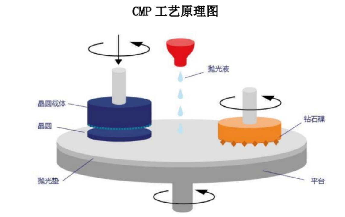 化學機械拋光(CMP)是半導體先進制程中的關鍵技術,其主要工作原理是在一定壓力下及拋光液的存在下,被拋光的晶圓對拋光墊做相對運動,借助納米磨料的機械研磨作用與各類化學試劑的化學作用之間的高度有機結合,使被拋光的晶圓表面達到高度平坦化、低表面粗糙度和低缺陷的要求。根據不同工藝制程和技術節點的要求,每一片晶圓在生產過程中都會經歷幾道甚至幾十道的CMP工藝步驟。與傳統的純機械或純化學的拋光方法不同,CMP工藝是通過表面化學作用和機械研磨的技術結合來實現晶圓表面微米/納米級不同材料的去除,從而達到晶圓表面的高度(納米級)平坦化效應,使下一步的光刻工藝得以進行。