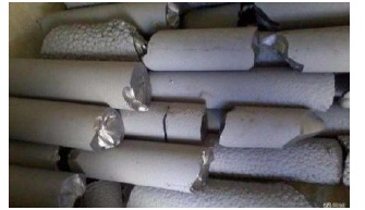 在改進(jìn)的西門子法多晶硅制造工藝中,多晶硅于爐子內(nèi)反應(yīng)由此產(chǎn)生U形的硅棒。一個(gè)硅棒規(guī)格往往長(zhǎng)度達(dá)到250公分,直徑則為130±20毫米左右,質(zhì)量達(dá)到270公斤。自爐子內(nèi)取出硅原料,通常要經(jīng)過(guò)破碎過(guò)程,最終才能形成硅材料包裝成品。