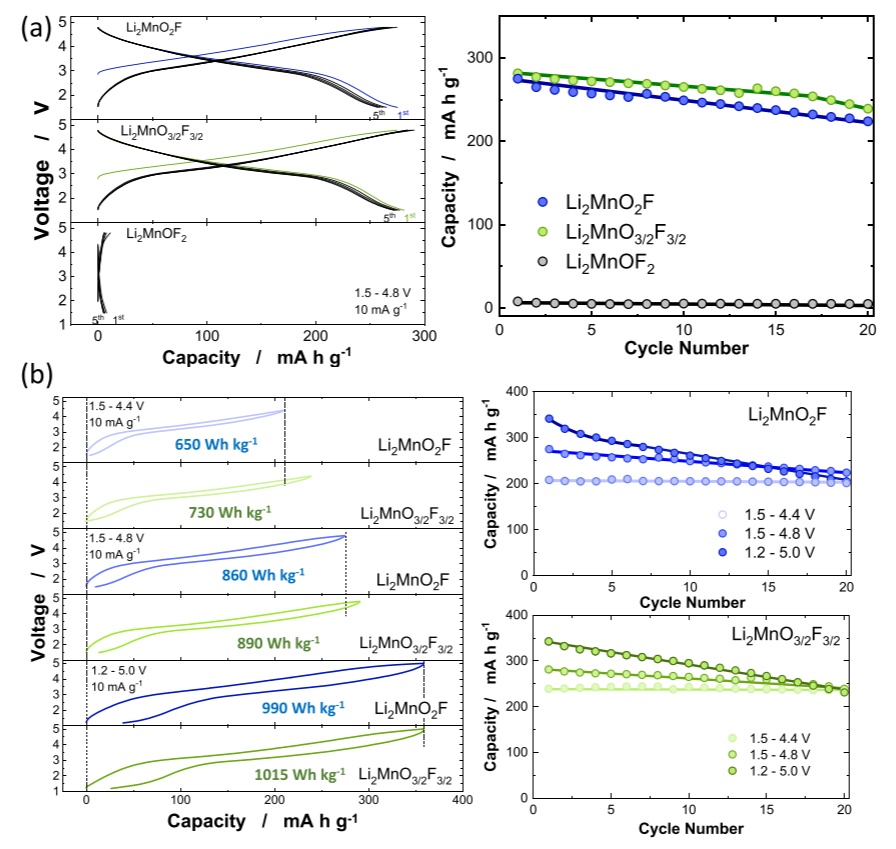 【圖2】(a)在電壓范圍為1.5-4.8 V,速率為10 mA g-1的條件下,Li2MnO2F、Li2MnO1.5F1.5和Li2MnOF2的電流充放電曲線和容量保持率。(b)比較不同充電截止電壓下的Li2MnO2F和Li2MnO1.5F1.5的充電/放電曲線和容量保持率。