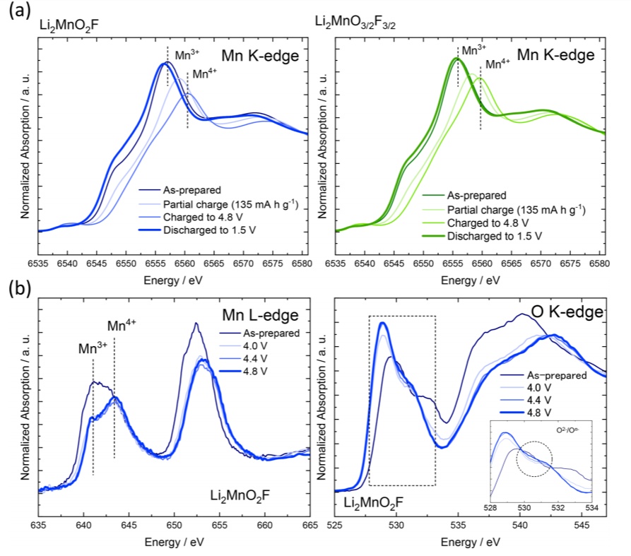 【圖3】(a)對Li2-yMnO2F和Li2-yMnO1.5F1.5的Mn K邊XAS光譜在電化學循環中的變化。(b)觀察不同充電狀態下Li2-yMnO2F的Mn L邊和O K邊XAS光譜。