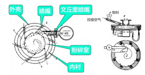 扁平式氣流粉碎機又稱水平圓盤式氣流磨是工業上應用最早、最廣泛的氣流粉碎機。具有結構簡單、操作方便、自行分級等優點,但設備沖擊動能不大,粉碎強度較低,處理硬度較高的物料時,機體內壁由于物料隨高速氣流的作用,物料與磨腔內壁產生劇烈地碰撞、摩擦,會加劇磨腔污染,對產品造成一定污染。適用物料廣,特別是各種聚集體或凝聚體構成的物料。