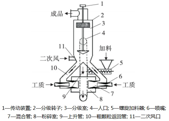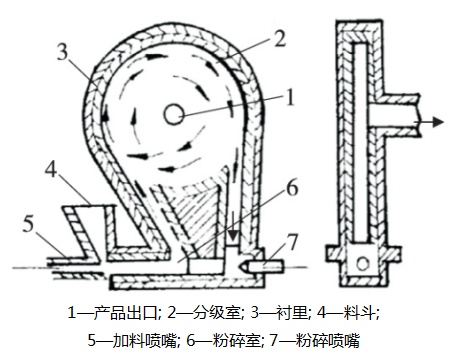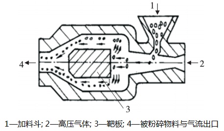對噴式氣流粉碎機又稱對撞式氣流磨、逆向噴射磨,是一種能量利用率高的設備。由于破碎過程主要依靠顆粒間的高速碰撞,可以有效避免高速氣流對沖擊部件的磨損,同時改善物料被污染的問題,產品粒度也較細;但設備占地面積較大、能耗高、粒度分布較寬。常用于粉碎堅硬、脆性、黏滯性的物料。