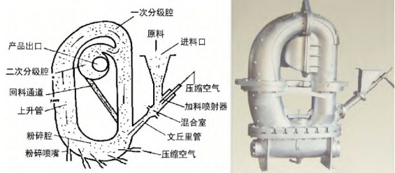 循環管式氣流粉碎機(立式環形噴射式氣流磨)具有粒徑分布小、無動力裝置、不易污染、物料不易黏壁等優點;但該類型設備的粉碎效率低、能耗大、內壁磨損嚴重。常用于脆性、低硬度物料粉碎,通常根據截面分成等圓截面和變截面循環管式。
