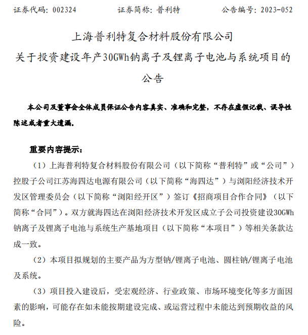中國粉體網訊 5月31日晚間,改性塑料龍頭普利特發布公告,為進一步完善控股子公司海四達的產能布局,增強新能源業務的影響力和綜合競爭力,公司擬在瀏陽經濟技術開發區投資建設年產30GWh鈉離子及鋰離子電池與系統生產基地項目。本項目建設年產30GWh鈉離子及鋰離子電池與系統,項目計劃分三期建設:一期投資約30億元建設12GWh方型電池項目;二期投資約30億元建設6GWh圓柱電池項目;三期投資約42億元建設12GWh方型電池項目。