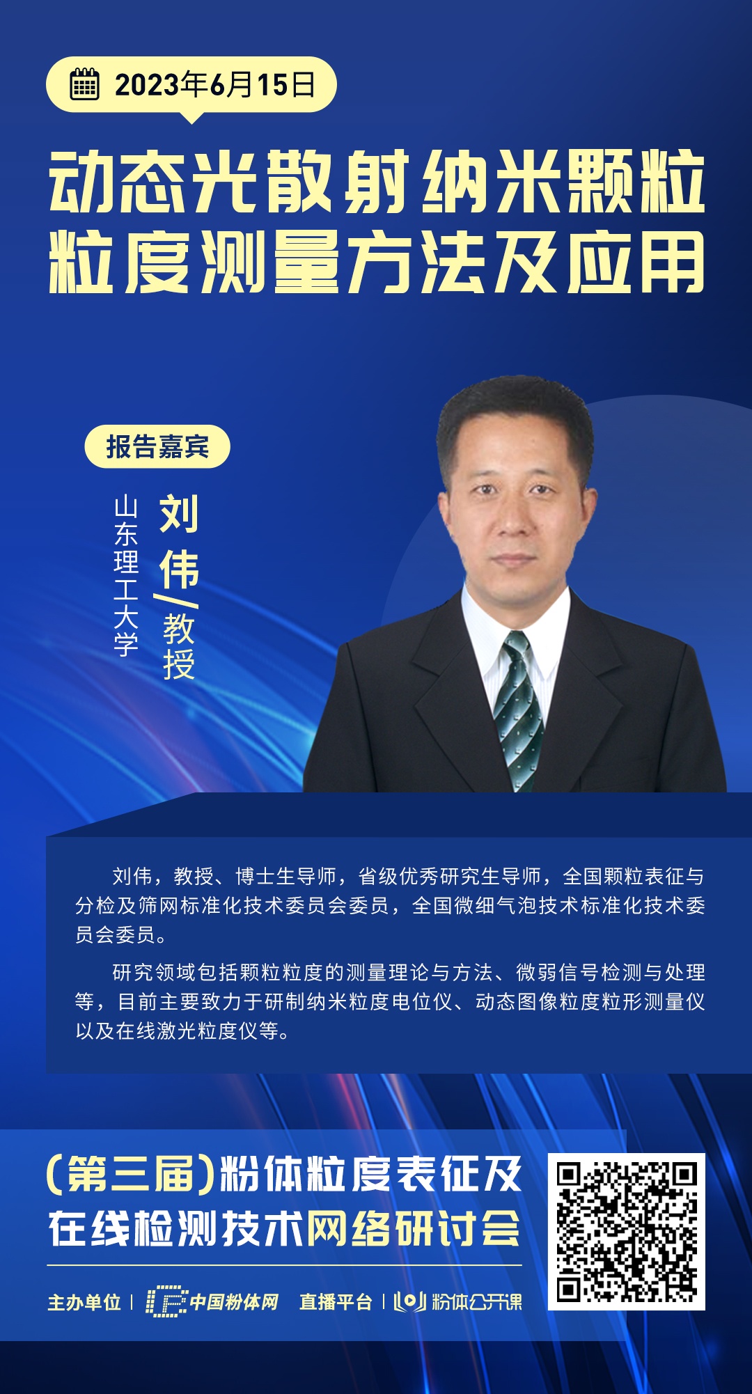 此次直播特邀山東理工大學劉偉教授做報告:動態光散射納米顆粒粒度測量方法及應用