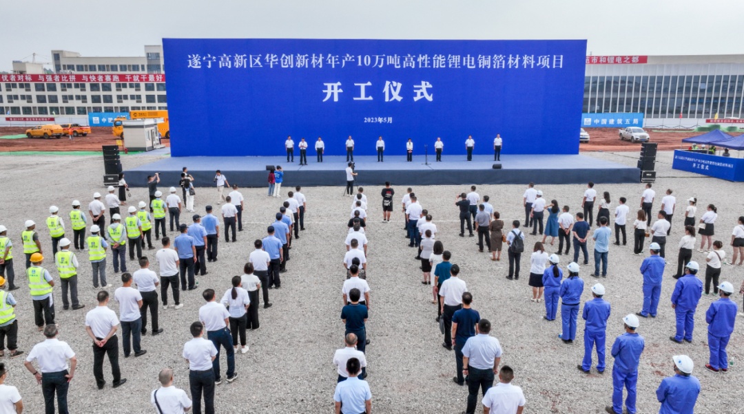 中國粉體網(wǎng)訊 5月31日上午,四川華創(chuàng)新材有限公司年產(chǎn)10萬噸高性能鋰電銅箔材料項目開工儀式在遂寧市高新區(qū)隆重舉行。遂寧市委書記李江,遂寧市委副書記、市長劉會英,市人大常委會主任周霖臨,安徽華創(chuàng)新材料股份有限公司董事長兼總裁周盛夫出席儀式。開工儀式由遂寧市委常委、副市長江彬主持。