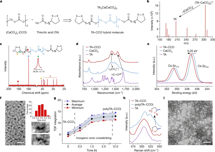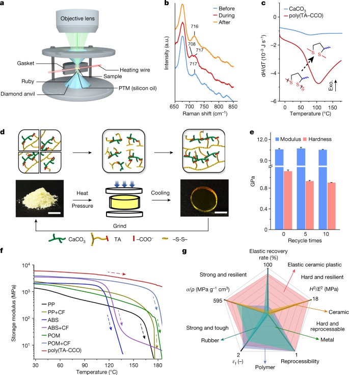 作者使用一種叫做硫辛酸(TA)的有機(jī)分子和一種由碳酸鈣低聚物(CCOs)組成的無(wú)機(jī)化合物來(lái)產(chǎn)生一種TA-CCO混合分子,其分子式為TA2Ca(CaCO3)2。這些分子的聚合在塊狀材料中產(chǎn)生了連續(xù)的相互穿透分子尺度共價(jià)域和離子域的網(wǎng)絡(luò)。令人震驚的是,這種材料結(jié)合了矛盾的機(jī)械性能。例如,它既顯示了硬度(在負(fù)載下對(duì)表面變形的抵抗力),又顯示了彈性,即在負(fù)載下通過(guò)彈性變形吸收能量的傾向,并在負(fù)載移除時(shí)釋放該能量。它還顯示了強(qiáng)度,即承受應(yīng)變而不失效或永久變形的能力。此外,網(wǎng)絡(luò)中的離子和共價(jià)鍵的可逆結(jié)合行為使該材料具有類似塑料的可塑性,同時(shí)保持其熱穩(wěn)定性。以這種方式將類似于陶瓷、橡膠和塑料的特性結(jié)合在一起的材料并不屬于目前的任何材料分類;因此作者將其命名為彈性陶瓷塑料。